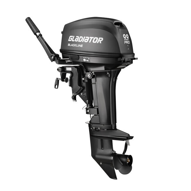 Лодочный мотор Gladiator 9.9 FHS PRO в матовом чёрном исполнении, особо популярен среди тех, кто хочет управлять мощным двигателем и не регистрировать его в ГИМС. Внешний топливный бак, объемом 24 литра, позволит ходить на средние и дальние береговые дистанции.
